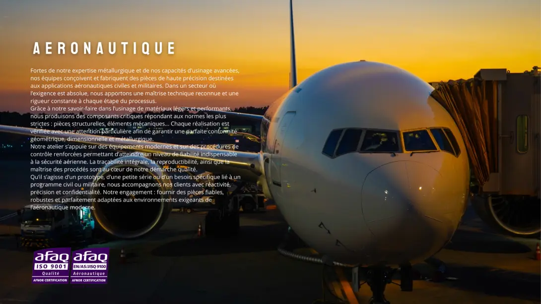 Certifiés ISO 9001 et ISO 9100, nous garantissons un niveau de qualité irréprochable, une traçabilité complète et un engagement constant envers l’excellence.